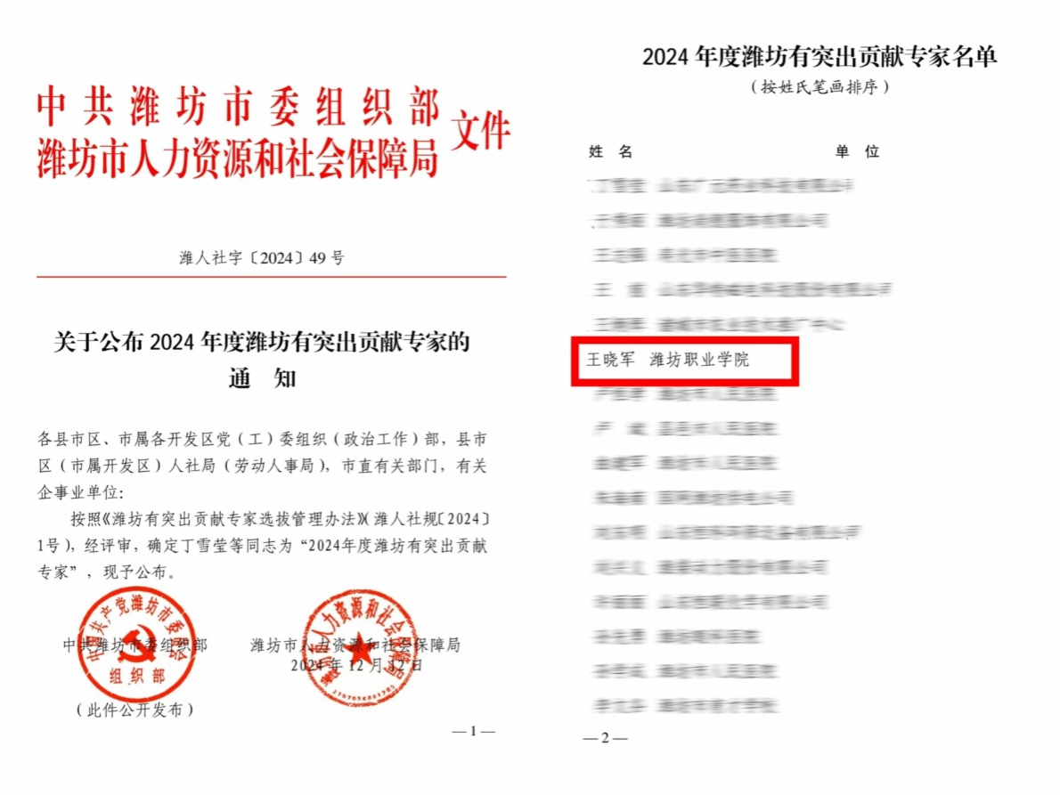 近日,中共潍坊市委组织部、潍坊市人力资源和社会保障局正式公布了“2024年度潍坊有突出贡献专家”评选结果,我院王晓军老师获此殊荣。王晓军,中共党员,博士研究生在读,beplay全站appbeplay全站app首页机电工程beplay(中国)综合办公室主任,潍坊市重点实验室负责人,主要从事电气自动化技术专业教学科研,以及职业教育研究工作。参与国家社会科学基金项目、山东省社会科学规划研究项目、山东省人文社会科学课题、山东省教育科学规划等项目研究工作,取得了丰硕的成果。...更多 -