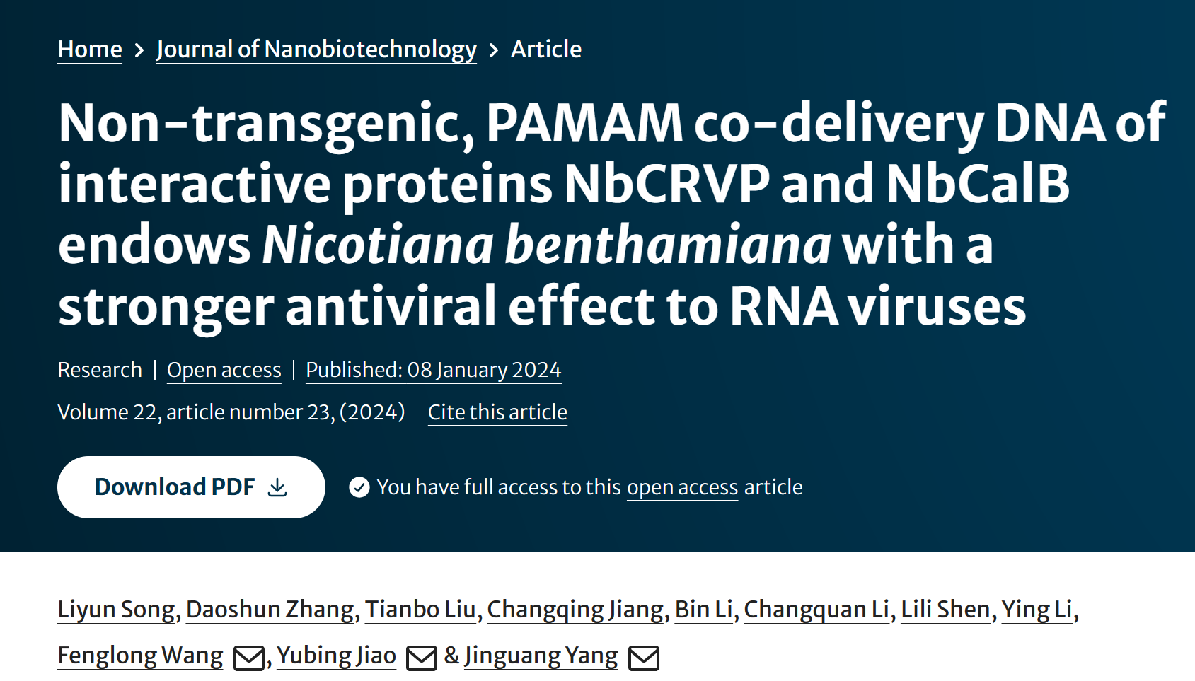 近日,农林科技beplay(中国)宋丽云博士在纳米递送互作蛋白防治作物病毒病方面取得重要进展,该研究与中国农业科beplay(中国)烟草研究所合作完成,相关成果发表在国际权威期刊《Journal of Nanobiotechnology》上,宋丽云博士为文章第一作者。 《Journal of Nanobiotechnology》(影响因子为10.2)是生物技术、纳米科技领域重点期刊,位列JCR中Q1区Top,这是beplay全站appbeplay全站app首页教师在自然学科顶级期刊发表的一篇力作。 目前,利用纳米颗粒递送...更多 -