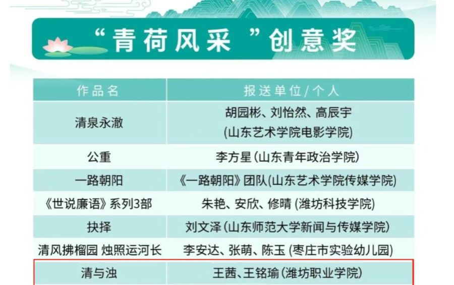 近日,由中国纪检监察杂志社、山东省纪委监委、山东省文学艺术界联合会、济南市纪委监委联合主办的第二届“青未了”杯廉洁文化作品创作大赛获奖名单正式揭晓,我院文化创意beplay(中国)王茜、王铭瑜两位教师报送的《清与浊》凭借其独具匠心的创意脱颖而出,斩获“青荷风采”创意奖。作品《清与浊》紧扣大赛主题,通过融合传统艺术与现代设计语言,生动展现了廉洁文化的时代内涵。其作品以“青荷”为意象,用其象征“出淤泥而不染”的品格,呼应“...更多 -