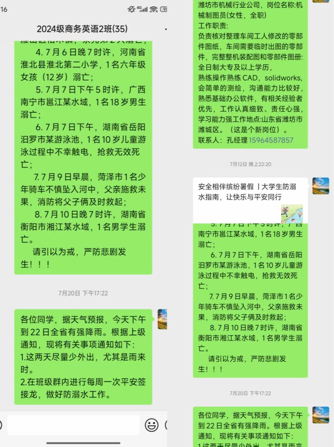 今年7月25日是第五个“世界预防溺水日”。为切实保障学生生命安全,筑牢暑期安全防线,国际商务beplay(中国)开展了暑期防溺水主题教育活动,确保安全教育“不断线”,关心关爱“不下线”。针对学生地域分布广、暑期实习实践多的特点,我院充分利用数字化手段,通过“每周安全播报”定点发送班级微信群等形式,实现安全教育的广覆盖和精准触达。通过假期“云家访”的方式,与学生及家长共同做好防溺水工作,重申“六不”准则和家长监护责任,...更多 -