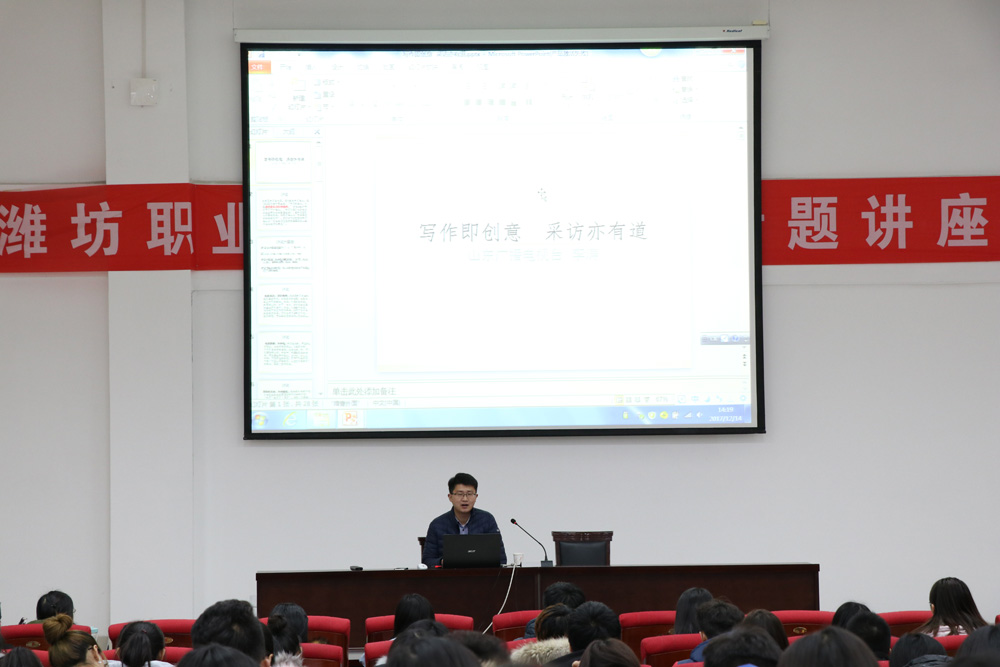 12月14日下午,山东广播电视台潍坊记者站新闻中心主任李涛应邀来我院滨海校区清泽楼413报告厅作《写作即创意,采访亦有道》专题讲座。宣传统战处负责同志、大学生记者团及新媒体工作室全体成员参加报告会。