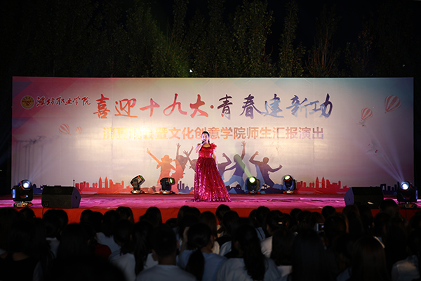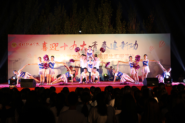 首先是由文创合唱团带来的《我和我的祖国》、《让我们荡起双桨》,之后是由舞蹈班学生带来的街舞《To be continued》等。毕业班级代表的歌舞《我们》,引发了同学们的美好回忆。幽默诙谐的舞台剧、青春飞扬的啦啦操等节目,展现了多姿多彩的校园生活,演出节目精彩纷呈,或青春洋溢、或大方自如、或如梦如幻,观众们的掌声和欢呼声此起彼伏,台上台下成了一片欢情四溢的海洋。最后,一曲大合唱《山丹丹花开红艳艳》为晚会画下完美的句号。(彭聪供稿)