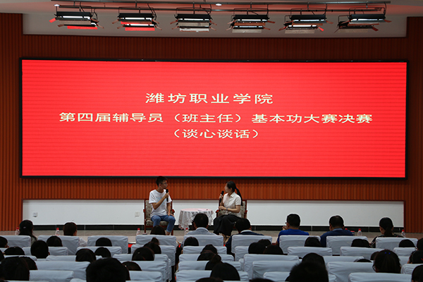 本次比赛自4月份开始,从初赛选拔、复赛、决赛,历时两个半月。比赛共分五个赛项进行。第一个赛项为“基础理论知识测试”,考核辅导员(班主任)对马克思主义理论、中国特色社会主义理论体系、习近平总书记系列重要讲话精神、思想政治教育专业知识、党团和班级建设、日常事务管理、心理健康教育、危机事件应对等理论知识、相关法律、法规的掌握。第二个赛项为“主题班会”,采用视频展示的方式,主要考察辅导员(班主任)综合运用思想政治教育、社会学、心理学、管理学、教育学等相关学科的知识和方法开展大学生思想政治教育的能力。通过一、二赛项的选拔,共有8名辅导员晋级决赛,在决赛现场,选手们进行了三个赛项的比拼。“主题演讲”赛项中,选手们结合“辅中有导,导中有辅”、“传道者首先要明道、信道”、“让职业成为事业”、“严与爱”四个主题进行了现场演讲,精炼的语言、缜密的逻辑、富有感召力的表达赢得现场师生们的喝彩。“案例分析”赛项中,选手们结合教育管理过程中遇到的学生人际关系处理、奖助学金评选、违纪现象、心理问题等常见或突发情况,进行分析判断,并现场提出解决问题的方案和措施。“谈心谈话”赛项中,选手们围绕校园贷、学习、恋爱、宗教传播等问题与学生进行现场交流沟通,解决处理教育管理中的棘手问题。