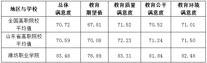5月17日,中国教育科学研究院发布《全国高等教育满意度调查报告》。我院以良好的育人环境、先进的实训条件、雄厚的师资力量与一流的教学质量,赢得了学生及社会各界的充分肯定,教育满意度各项指标得分均明显高于全国和山东省高职院校平均水平。