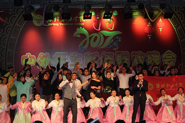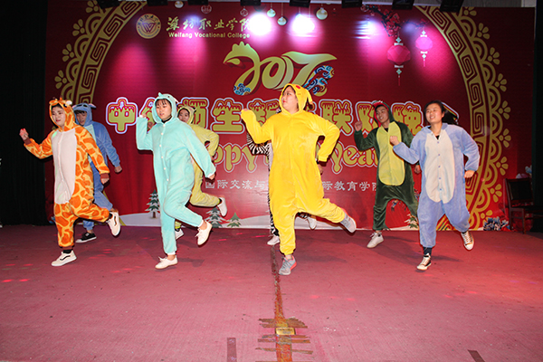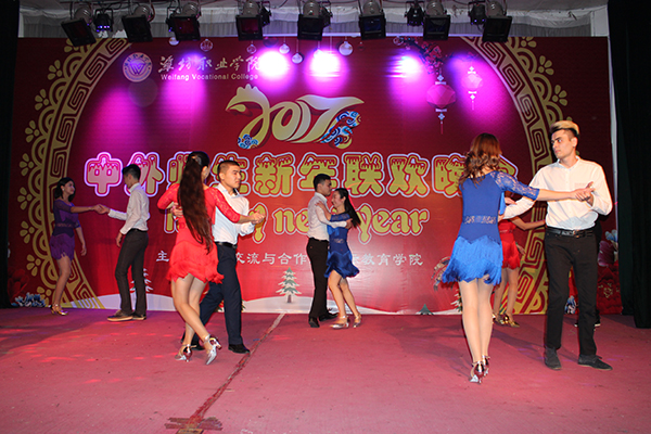 12月27日晚,我院2017年中外师生新年联欢晚会在奎文校区报告厅举行。奎文校区办公室、五年制高职部、国际交流与合作处的相关负责同志,以及新加坡商会驻潍企业代表、美国外教及中外师生500余人欢聚一堂,共同观看了晚会演出。
