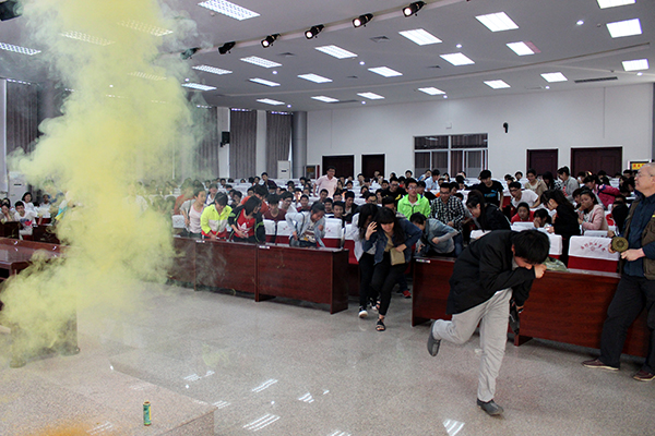 消防知识讲座是beplay(中国)2015年防灾减灾日宣传周活动的一项内容,旨在增强广大师生防范各类自然灾害的意识、自救互救能力及消防知识的学习,参与防灾减灾应急演练,构建平安校园。讲座上,马慧超参谋结合具体的事例进行了讲解,让广大师生了解和掌握如何树立消防意识、如何扑灭火灾、火灾现场如何逃生、灭火器的使用方法等。讲座结束时,进行了消防演练。随着报告厅里冒起滚滚浓烟,一阵刺耳而又紧急的消防警报声响起,同学们在老师的指导下,弯着身体快速有序地按照逃生路线撤离报告厅。(杨广玉供稿)