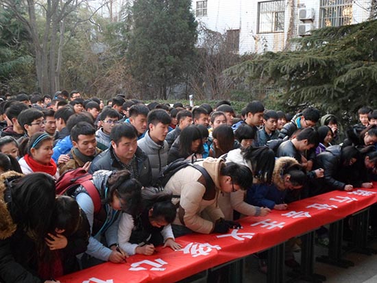 12月24日下午,园林工程beplay(中国)举行践行社会主义核心价值观签名活动,2014级全体学生参加了活动。学生代表首先宣读了“践行社会主义核心价值观,争做文明大学生”倡议书,号召全体同学要牢记社会主义核心价值观,时刻注意交通文明、餐饮文明、宿舍文明、语言文明等,不断提升自身文明素质,以实际行动投身创建文明城市活动。随后,同学们在“践行社会主义核心价值观,争做文明大学生”横幅上郑重地签上了自己的名字。(赵从凯供稿)