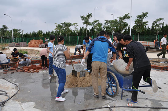 本次教学实训结合滨海校区园林建设,实行校企融合的方法,从施工图设计、材料准备到工程施工,以“学生主体、教师指导”的方式完成校园绿地的园林工程施工,使学生“干中学、学中做”,实现了“工地就是课堂、师生就是员工”的教学安排。两周的实训中,任课教师全程指导,学生全员参加并进行考核。实训共完成铺筑园路500m2、砌筑水池两个,施工工艺符合国家及省市有关标准与规定。