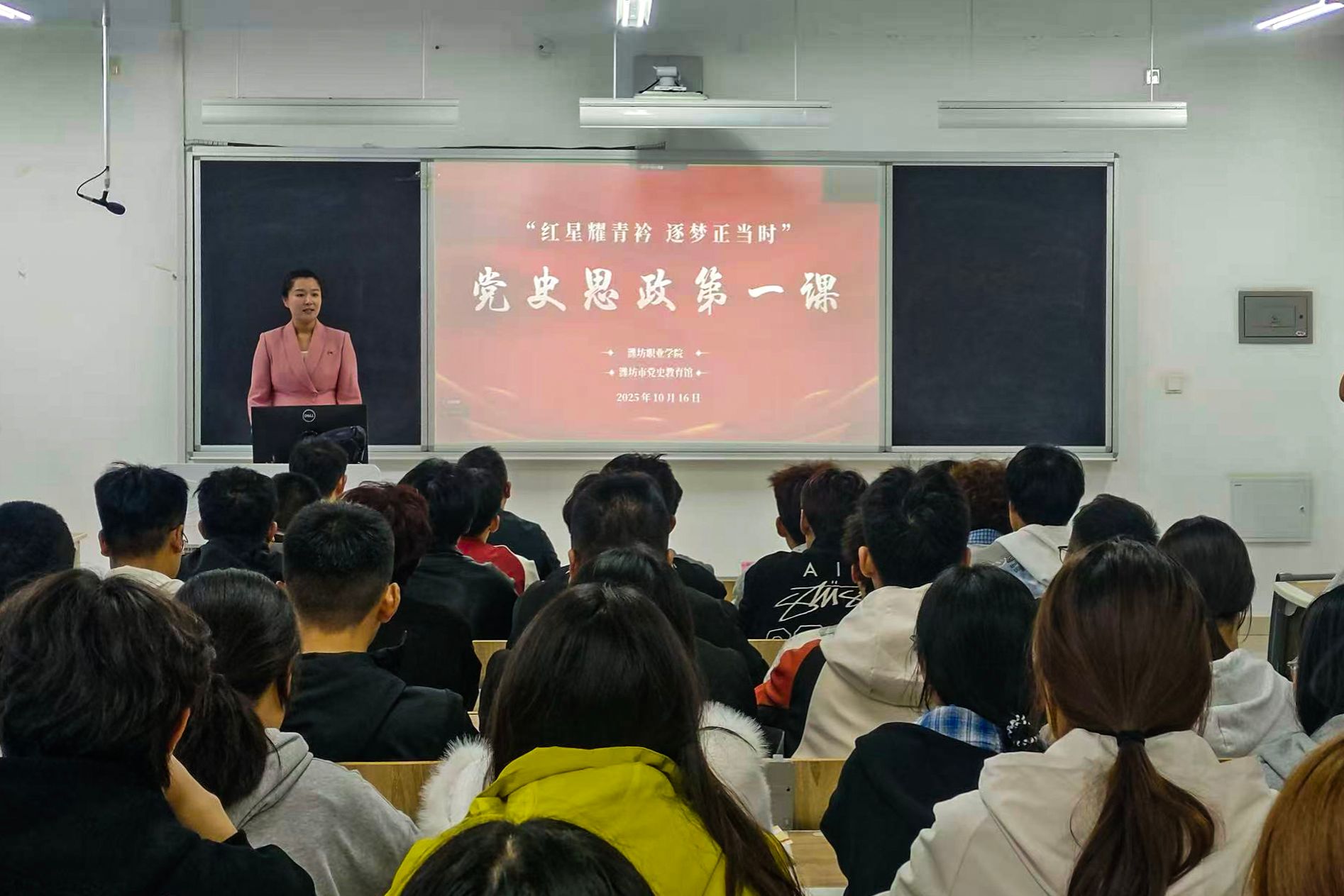 为深入贯彻落实习近平总书记关于党史学习教育的重要指示精神,充分发挥潍坊红色资源育人功能,10月16日,beplay(中国)联合潍坊市党史教育馆开展“党史思政第一课”活动。潍坊市党史教育馆王鑫、张浩磊为学生授课,滨海校区2025级学生代表在智泽楼主会场参与现场学习,其余学生通过钉钉直播线上同步观看。马克思主义beplay(中国)党支部负责人主持活动。