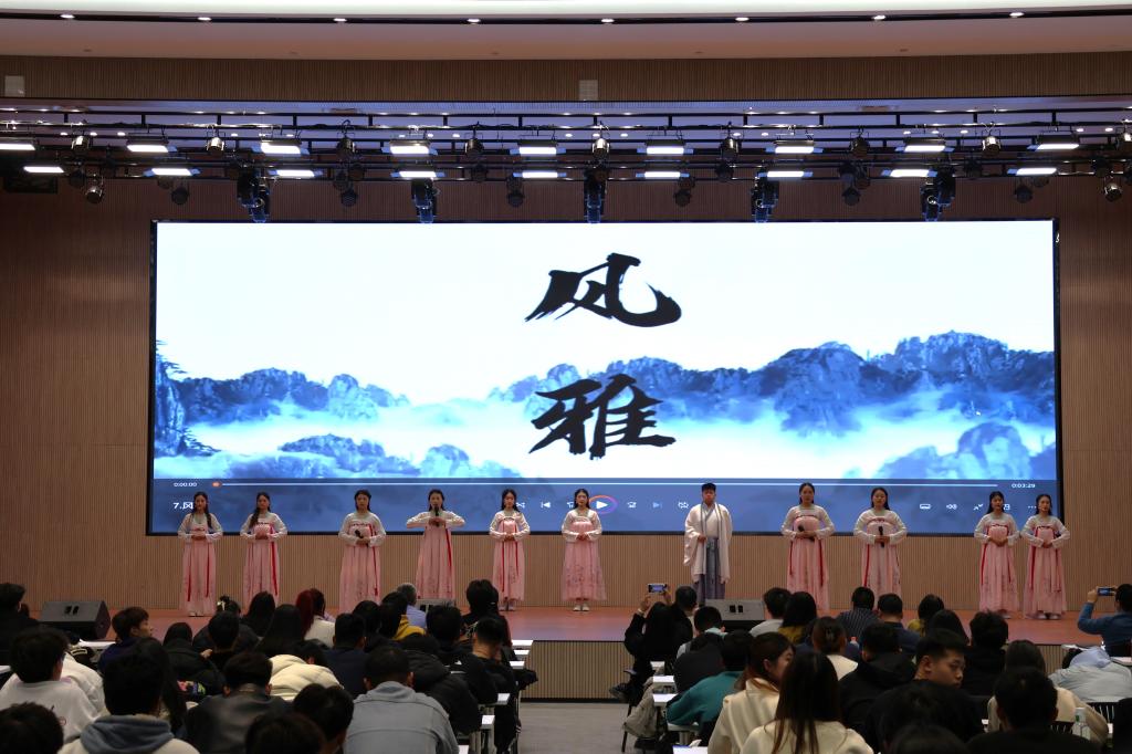活动现场,参赛学生借助音乐、服装、吟诵等手段融合展现诵读内容,场面宏大,气氛浓烈。一篇篇传世经典经过师生们的精心编排和精彩表演,或热情洋溢,或抑扬顿挫,或抒情婉约,或激昂壮阔,再现了中华优秀传统文化的无穷魅力。经过精彩较量,最终《满江红》《风雅》《诗词人生念易安》3个作品获一等奖,《关雎》《琵琶行》《孟子》等5个作品获二等奖,《梦游天姥吟留别》《春江花月夜》《将进酒》等8个作品获三等奖。