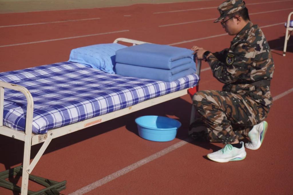 内务整理是军训中重要内容之一。通过内务比赛,不仅让学生对军队内务整理有了深刻的了解,学到了内务整理的技巧,也培养了良好的生活、行为习惯。(桑秀杰 李先兵供稿)