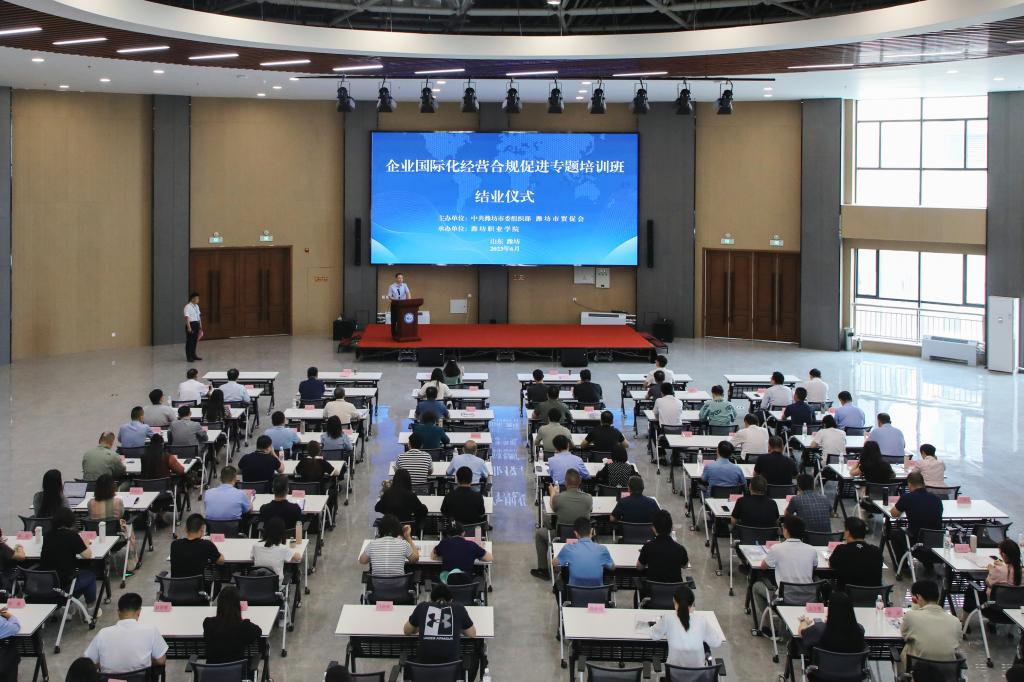6月2日下午,由中共潍坊市委组织部、潍坊市贸促会主办,beplay全站appbeplay全站app首页承办的“企业国际化经营合规促进专题培训班”在beplay(中国)国际学术交流中心二楼报告厅举行结业仪式。潍坊市贸促会党组书记、会长胡文星,beplay(中国)副院长陈美霞出席仪式,全体培训学员参加仪式。