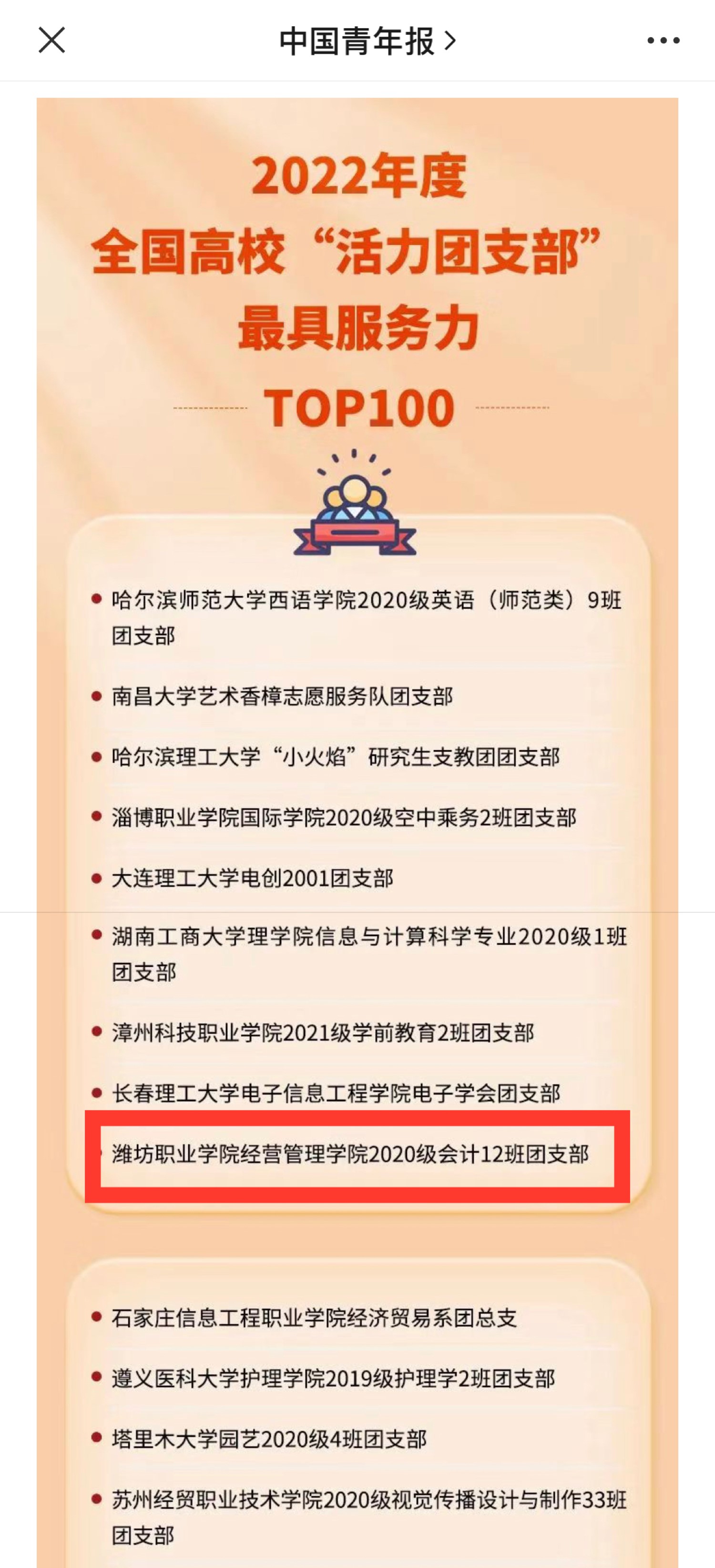 近日,由团中央基层建设部指导、中国青年报社主办的2022年度全国高校“活力团支部”风采全国展示活动落下帷幕。我院经营管理beplay(中国)2020级会计12班团支部脱颖而出,荣登2022年度全国高校“活力团支部”最具服务力TOP100榜单。