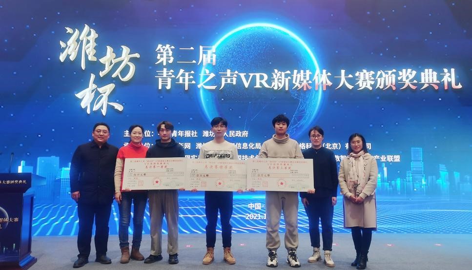 2021年12月30日,第二届青年之声VR新媒体大赛总决赛颁奖典礼在富华国际会议中心举办。我院信息工程beplay(中国)参赛的作品《龙宫探宝》获得总决赛唯一的特等奖;《潍坊非遗风筝VR展示》获得总决赛一等奖;《数字校园》获得总决赛三等奖。王世霖、王梦禹、贺春旭三名同学代表团队上台领奖,王世霖同学作为学生代表上台发言。