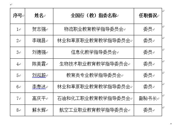 2021年11月,教育部印发《关于公布全国行业职业教育教学指导委员会(2021—2025年)和教育部职业院校教学(教育)指导委员会(2021—2025年)组成人员和工作规程的通知》(教职成函〔2021〕13号),公布了57个行指委、5个教指委组成人员名单。我院8名教师入选新一届行(教)指委委员,任期五年。