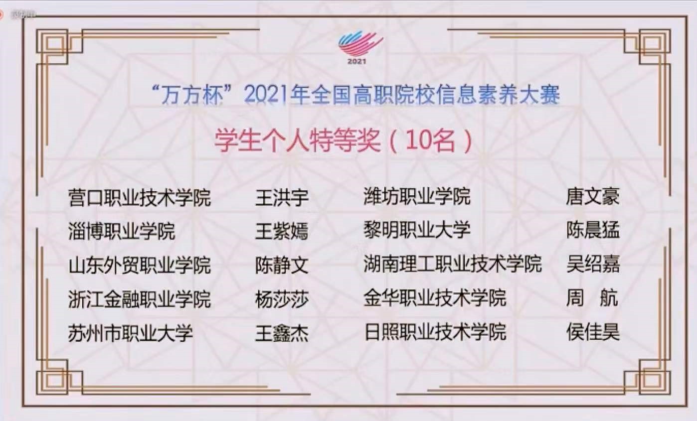 12月12日,第三届“万方杯”全国高职院校信息素养大赛决赛答辩赛圆满结束。我院机电工程beplay(中国)唐文豪同学凭借扎实的信息素养基本功与良好的心态,在全国众多参赛选手中脱颖而出,以全国第六名的成绩荣获特等奖,信息工程beplay(中国)蔡晓宇同学荣获三等奖,我院图书馆获最佳组织奖。我院也是山东省自去年以来连续蝉联特等奖的唯一院校。