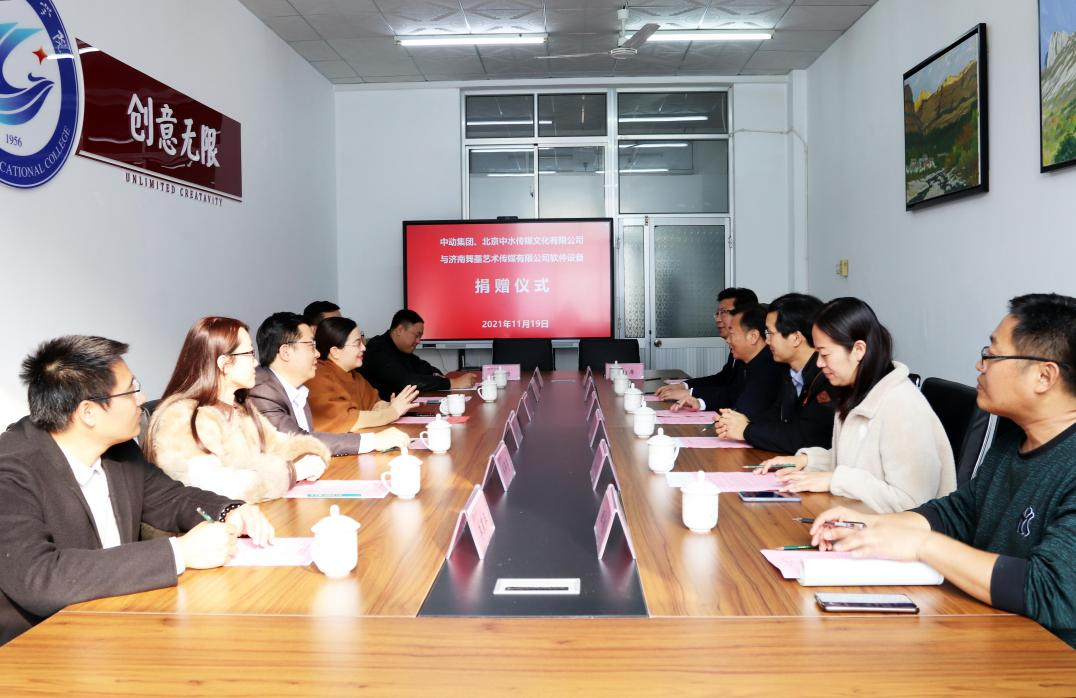11月19日上午,中动集团(山东中动教育科技有限公司)、北京中水传媒文化有限公司和济南舞墨艺术传媒有限公司软件设备捐赠仪式在文化创意beplay(中国)举行。beplay(中国)党委委员、副院长贺志强,中动集团执行长卢红星、济南舞墨艺术文化传播有限公司总经理朱戎墨,科技处、文化创意beplay(中国)主要负责同志及相关专业教师出席仪式。