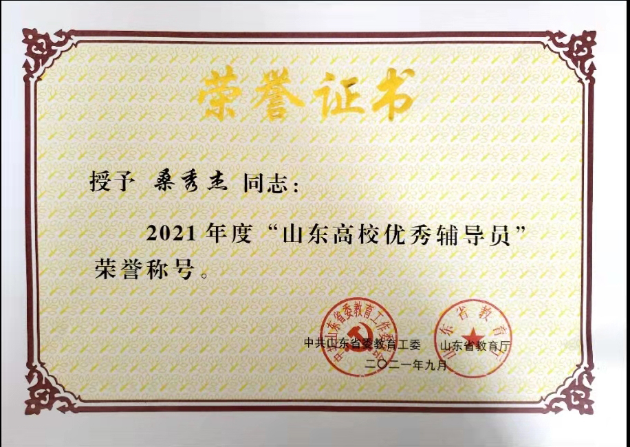 近日,由中共山东省委教育工委、山东省教育厅组织开展的2021年度“山东高校辅导员年度人物”“山东高校优秀辅导员”评选结果揭晓,我院食品药品beplay(中国)桑秀杰老师获“山东高校优秀辅导员”荣誉称号。在各高校选拔推荐的基础上,全省共评出10名山东高校辅导员年度人物和59名山东高校优秀辅导员。