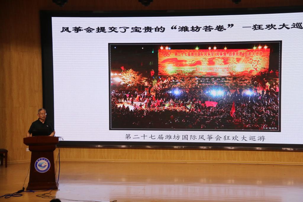 6月3日,学校第69场人文素养讲座在奎文校区16号楼报告厅举行,潍坊市教科卫体委副主任张崇高为同学们作了一场题为“风筝文化与潍坊国际风筝会”的精彩讲座,奎文校区近300名师生聆听了讲座。