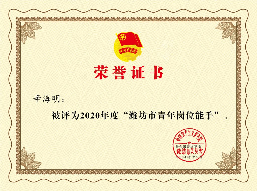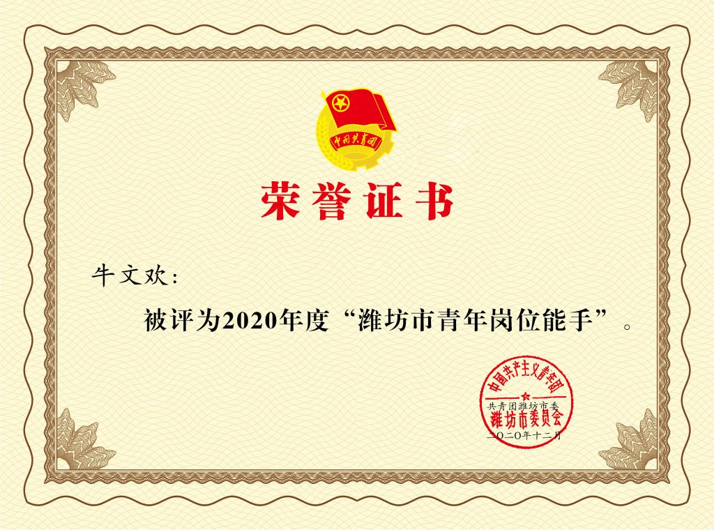 近日,由共青团潍坊市委组织的2020年度潍坊市青年岗位能手评选活动落下帷幕。我院牛文欢、辛海明、昌厚峰三名青年教师获“潍坊市青年岗位能手”称号。
