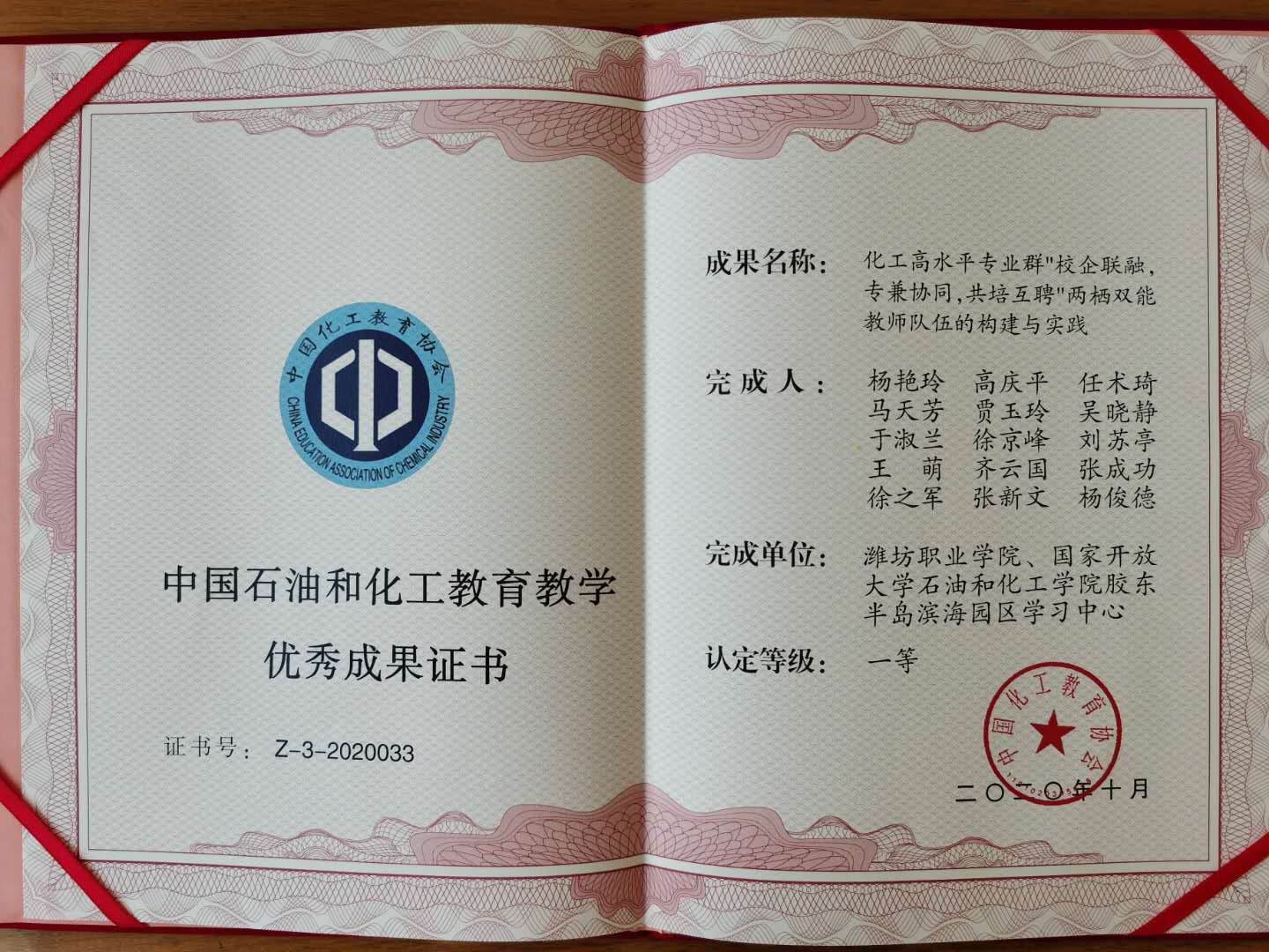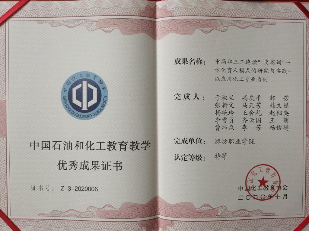 中国化工教育年会宣读了第五届中国石油和化工教育教学成果的认定结果,并向优秀成果获奖者代表颁发了荣誉证书。中国石油和化工教育教学成果每4年评定一次,本届参评成果400余件,按不超过申报总数的5%、15%、30%比例评选出优秀本科教学成果66项、论文31篇,优秀职教教学成果88项、论文39篇,其中特等奖仅16项(本科7项、高职9项)。我院喜获优秀教学成果4项,其中山东省教育教学于淑兰名师工作室核心成员主研的《中高职三二连读“岗赛训”一体化育人模式研究与实践》、《化工高水平专业群“校企联融,专兼协同,共培互聘”两栖双能教师队伍的构建与实践》,《“双元四段,精准育人”化工现代学徒制人才培养模式构建与实践》依次荣获特等奖、一等奖、二等奖。