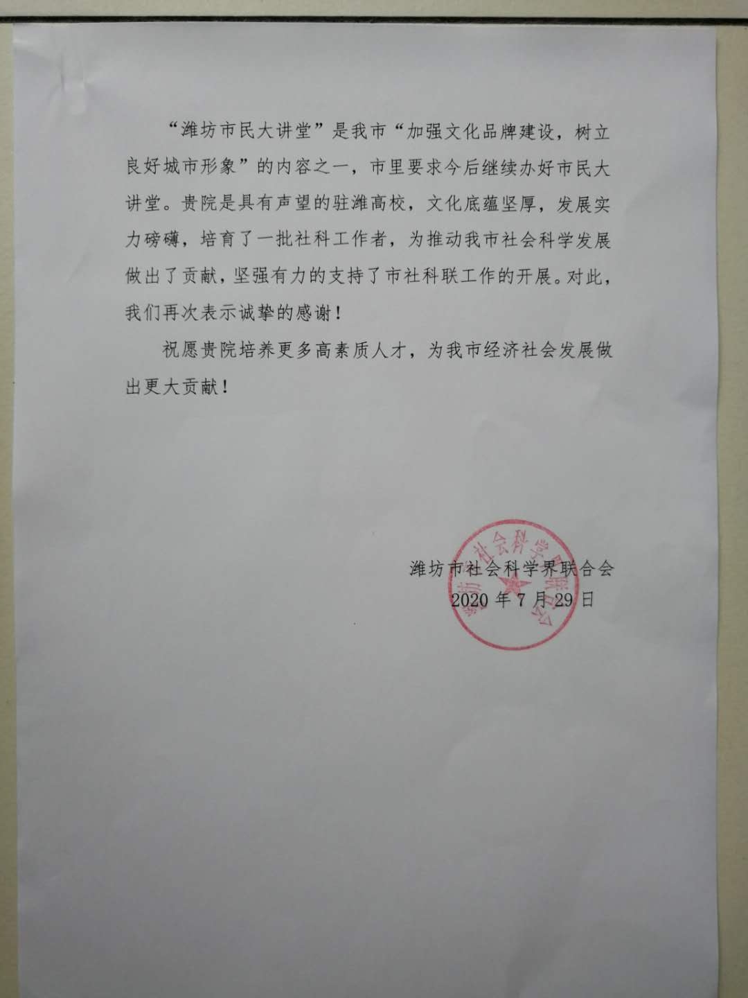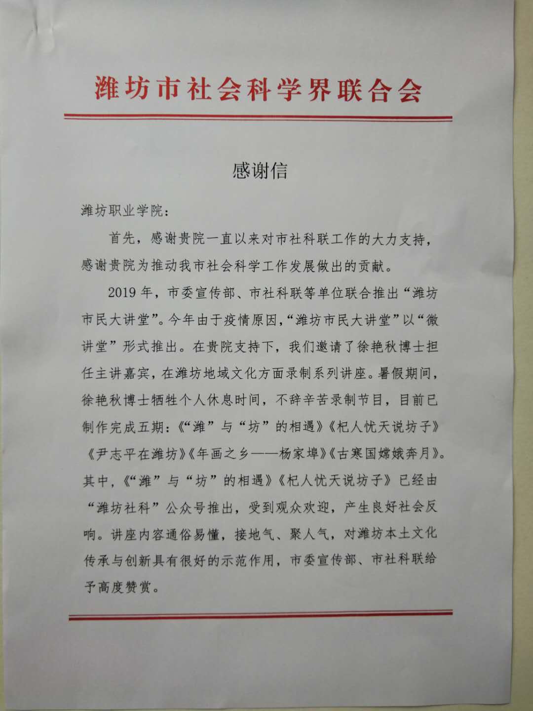 近日,beplay(中国)收到潍坊市社会科学界联合会发来的感谢信,信中对我院对市社科联工作的大力支持表示感谢,并对我院徐艳秋博士参加“潍坊市民大讲堂”活动给予高度赞赏。