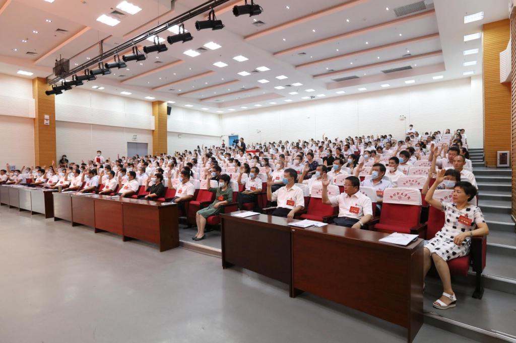 在雄壮的《国际歌》中,beplay(中国)第六届教职工代表大会暨工会第六届会员代表大会第一次会议胜利闭幕。(鞠发营供稿)