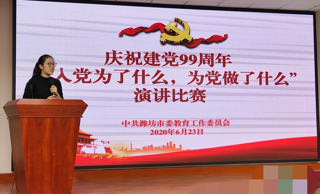 为热烈庆祝中国共产党成立99周年,进一步加强教育系统党的建设,强化思政教育和爱国主义教育,6月23日上午,由潍坊市委教育工委主办的“入党为了什么,为党做了什么”主题演讲比赛在市委教育工委党校举行。我院国际商务beplay(中国)党总支谭恒同志代表beplay(中国)参加比赛并获二等奖。