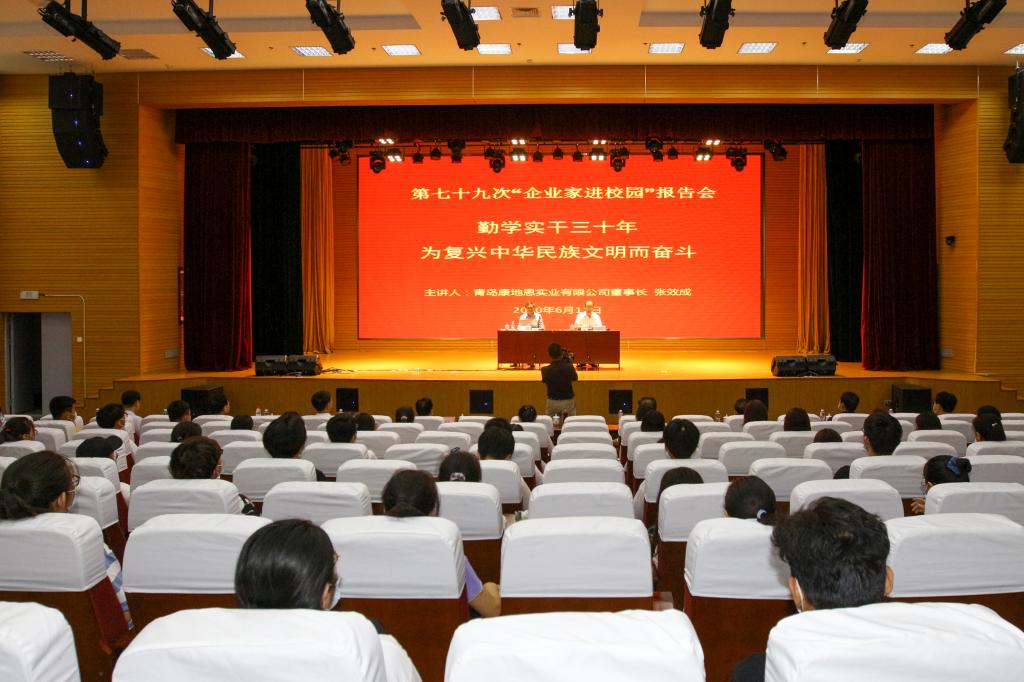 张效成现任青岛蔚蓝生物股份有限公司董事,青岛康地恩实业有限公司董事长。他的报告围绕改革开放以来经济社会的快速变迁和巨大变化,结合个人拼搏奋斗的职场经历和深刻的人生感悟,从“沐浴在中华民族文明精神的阳光之下,过去是史、未来是梦、当下是真,‘和’‘善’文化的人生解读”三个方面,为同学们作了精彩报告,报告引经据典、旁征博引、深入浅出地通过自己的人生经历为同学们阐释了企业“和、善、干、学”的理念和企业文化。整场报告充满了就业创业的智慧和人生成长的宝贵经验,富含发人深思的人生哲理,折射出博大璀璨的传统文化光辉,展现了当代企业家的民族担当和家国胸怀,令与会人员意味隽永、受益匪浅。张效成告诫并号召同学们一定珍惜当下国家的好政策、好环境,用勤奋、热情、承担三种优秀品质,刻苦磨练自己,不忘初心,奋斗不息,为实现中华民族伟大复兴的中国梦而奋斗。