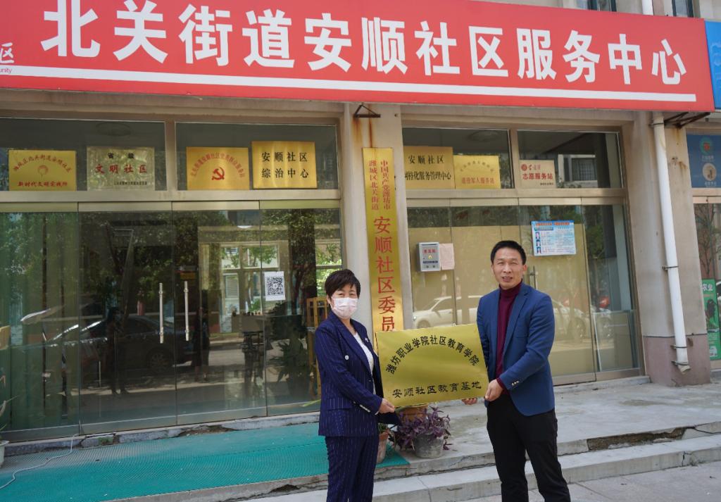 5月19日上午,beplay全站appbeplay全站app首页社区教育beplay(中国)安顺社区教育基地揭牌仪式在潍坊市潍城区北关街办安顺社区居委会举行。社区教育beplay(中国)的负责同志、安顺社区居委会书记孙海霞以出席揭牌仪式。社区教育beplay(中国)与安顺社区居委会共同签订了社区服务协议,开启了我院与安顺社区二级联办的社区服务工作。