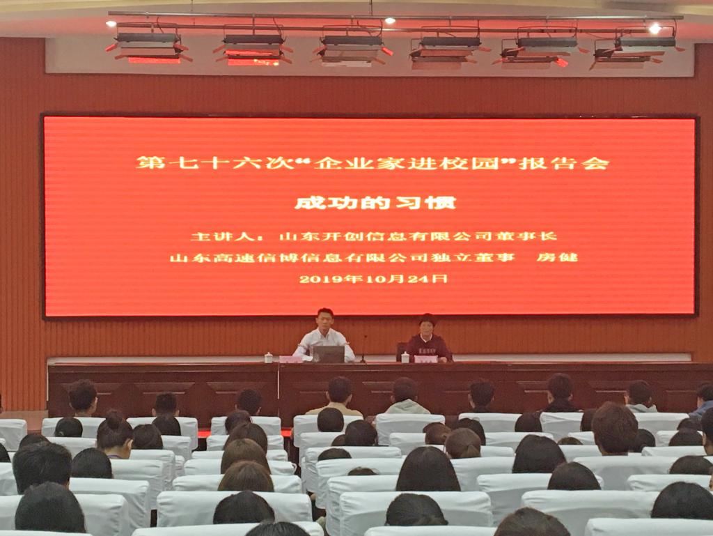 10月24日下午,学校第76次“企业家进校园”活动报告会在清泽楼报告厅举行。山东开创信息有限公司董事长房健作了“成功的习惯”主题报告。科技处(产学研合作中心)相关人员和经营管理beplay(中国)300余名师生参加了报告会。