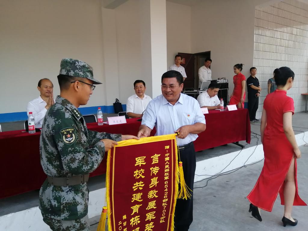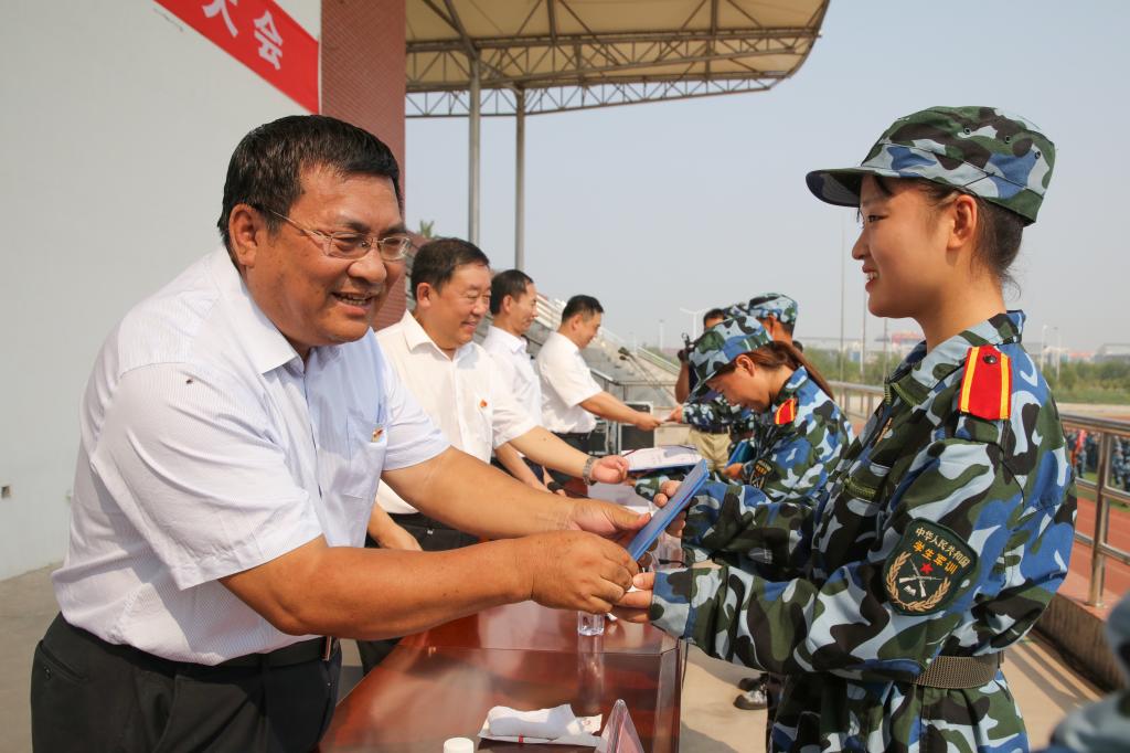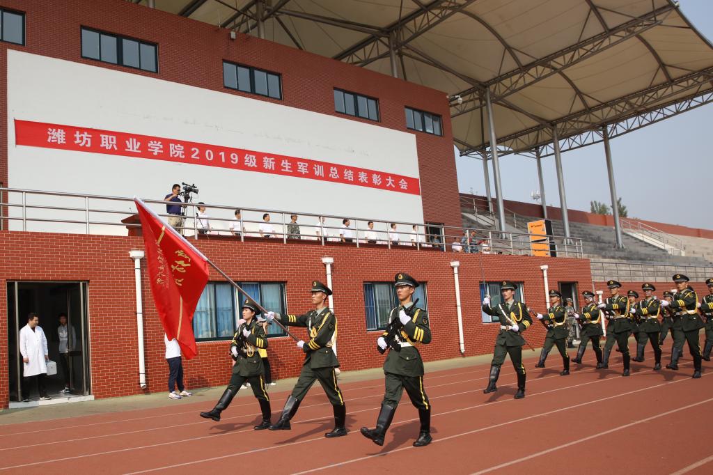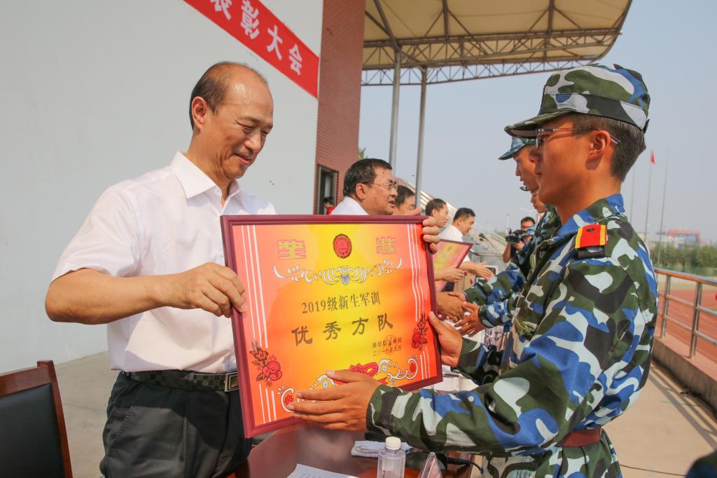 马跃启作讲话。他代表beplay(中国)党委行政向承担军训任务的全体教官表示感谢,向参加军训的全体新同学表示问候,向受表彰的先进集体和个人表示祝贺。他说,军训是大学生在校期间接受国防教育的基本形式,也是强化学生国防教育、提高军事技能、培养爱国主义精神、增强集体主义意识的重要举措。今年军训工作组织有序、内容丰富,穿插进行了新生入学教育,组织开展了安全教育、内务比赛、歌咏比赛和防震抗灾及消防紧急疏散演习等活动,广大新生学到了军事知识和技能,激发了爱国热情,增强了国防意识和合作意识。军训期间,教官们以身作则、身先士卒、率先垂范、严格要求、科学施训,体现出过硬的军事素质和优良作风。全体受训同学在教官和辅导员、班主任的悉心指导、严格要求下,吃苦耐劳,纪律严明,听从指挥,刻苦训练,用辛勤的汗水和踏实的行动,交出了一份圆满的答卷,充分展示了当代大学生良好的精神风貌和青春魅力。他对同学们提出了希望:一是继续巩固好军训成果,把不怕苦、不怕累的精神,把责任意识、纪律意识和集体观念,带到今后的学习和生活中去。二是弘扬“崇实尚行”潍职文化,发扬“敢于争先”潍职精神,专心学习,苦练本领,尽快成长,努力成才。三是高扬爱国主义旗帜,增强使命担当,矢志不渝听党话、跟党走,与国家、民族同呼吸、共命运。四是希望大家乘新时代春风,放飞青春梦想,为实现“两个一百年”奋斗目标和中华民族伟大复兴的中国梦而努力奋斗,让青春在拼搏中焕发出更加绚丽的光彩。
