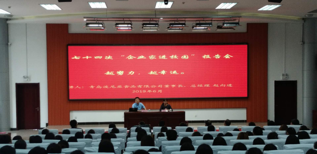 6月13日,beplay全站appbeplay全站app首页第74次企业家进校园活动在滨海校区明德讲堂举办。青岛波尼亚食品有限公司董事长赵向进以“努力奔跑,我们都是追梦人”为题,为食品药品beplay(中国)教师和食品专业300余名同学作了一场精彩报告。报告会由食品药品beplay(中国)负责人主持。