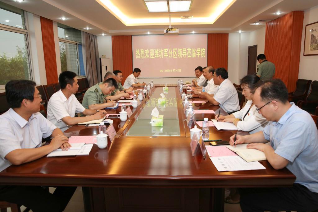 6月4日,潍坊军分区司令员丁峰来我院调研大学生征兵工作。beplay(中国)党委书记马跃启、院长王家爱、党委副书记宋桂言,滨海区党工委副书记李树森,寒亭区武装部部长刘罡、beplay(中国)武装部主要负责同志等陪同调研和座谈。