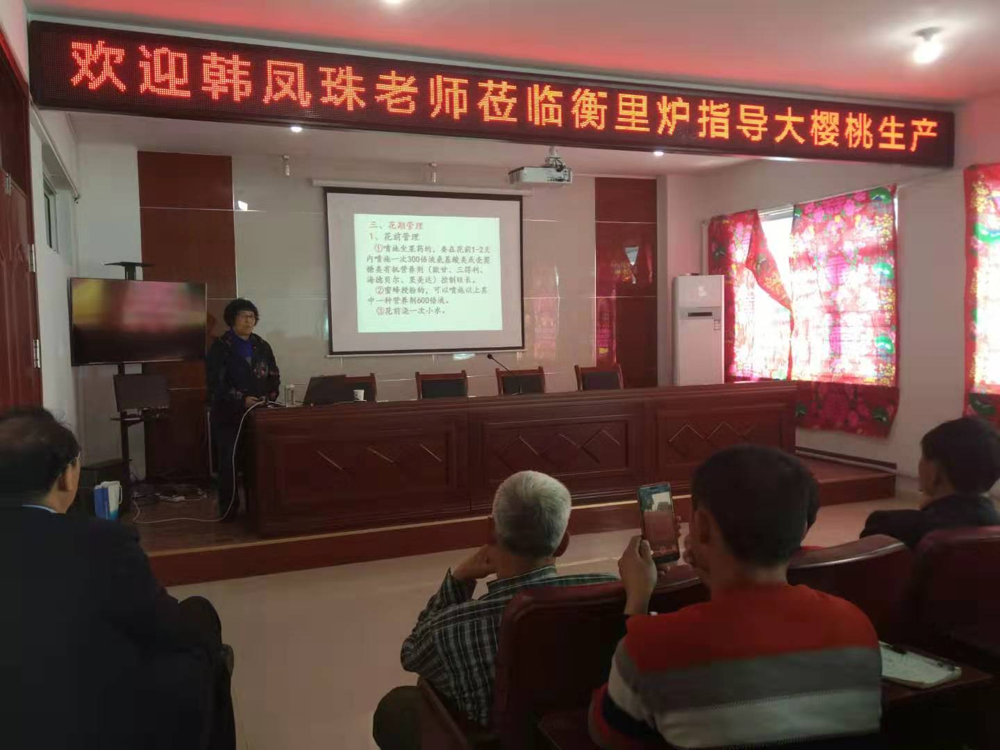 培训按照“因人制宜、按需培训、分类指导”的工作思路,采取理论教学与实践教学相结合、教师讲授与学员讨论相结合、课堂讲授与田间指导相结合等丰富多样的培训方式,根据潍坊市大樱桃种植户当前的需求,围绕当前大樱桃的栽培管理、病虫害防治及品牌塑造等方面,讲授了《大樱桃优质高产栽培技术》、《果树病虫害防治技术》、《农产品品牌塑造及电商营销》等方面的知识。现场实地指导过程中,辽宁省果树研究所韩凤珠教授就当前临朐县大樱桃肥水管理、丰产后果品品质提升、果树修剪、农药包装物回收与环境污染、土壤营养元素管理等方面做了详细指导。