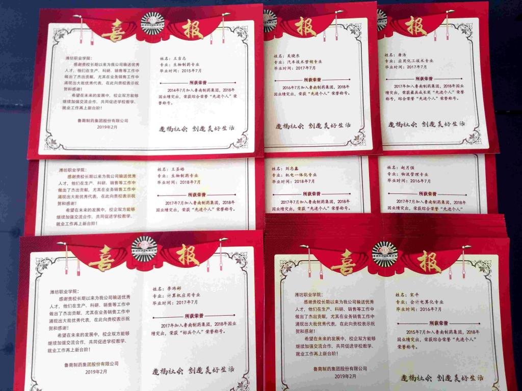 3月21日,鲁南制药集团股份有限公司专门派人到我校送来喜报,感谢我校长期以来为该公司输送优秀人才。我校毕业生在生产、科研、销售等工作中为企业做出了杰出贡献, 2018年王吉志等20名毕业生荣获年度综合荣誉“先进个人”称号,公司负责人高度赞扬了我院毕业生过硬的专业技能和饱满的工作态度,并对我院的就业工作给予了高度评价,希望校企双方能够进一步加强交流合作,共同促进学校教学、就业工作再上新台阶。