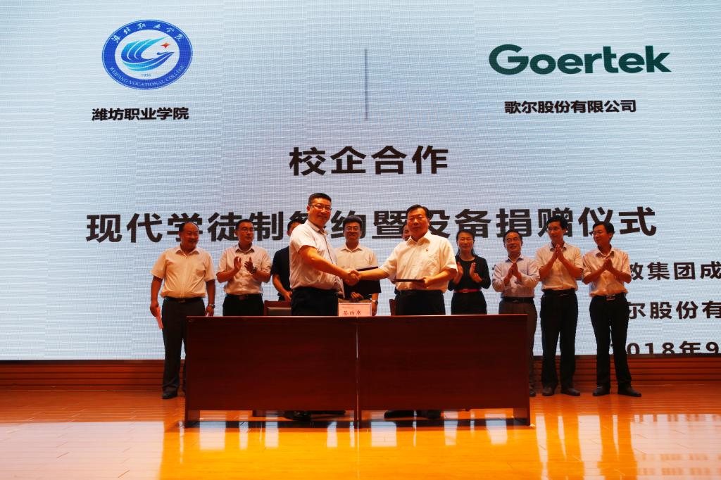 批现代学徒制试点单位。近年来,我院积极开展现代学徒制人才培养模式的实践探索,建成了国邦beplay(中国)、远成物流beplay(中国)和福田汽车beplay(中国)三个现代学徒制特色二级beplay(中国),形成了“省级试点项目引领、院级试点项目带动、重点专业积极跟进”的良好格局。我院在省级现代学徒制试点专业建设基础上,遴选数控技术、应用化工技术、汽车制造与装配技术和电气自动化技术4个专业开展试点并顺利入围,取得优质校建设的又一项国家级标志性成果。beplay(中国)立足服务新旧动能转换重大工程和产业升级,进一步深化产教融合,推进校企深度合作,9月18日,beplay(中国)与歌尔股份有限公司校企合作现代学徒制拜师暨设备捐赠仪式在滨海校区举行,歌尔公司为我院捐赠680余万元设备,为校企一体化育人再添重彩。