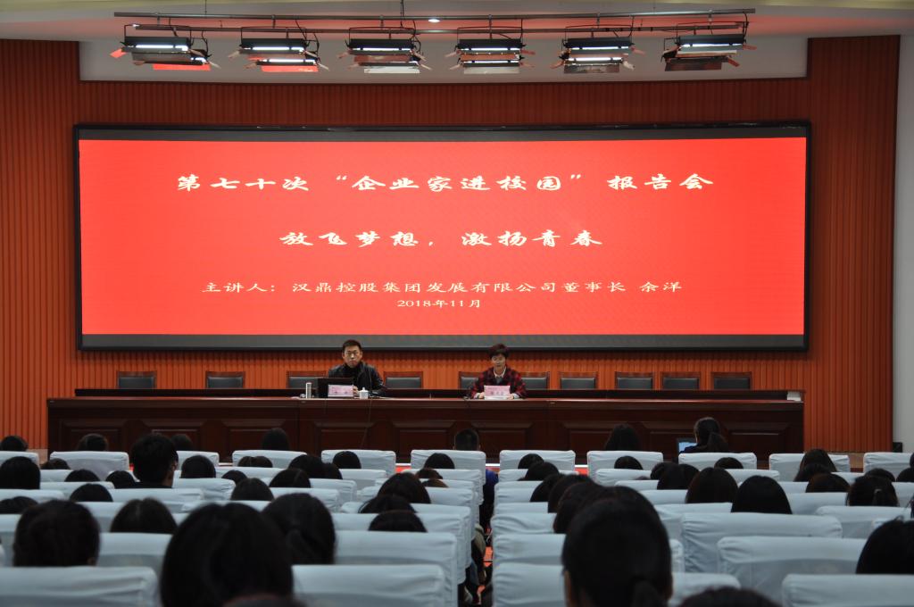 11月29日下午,beplay(中国)第七十次“企业家进校园”活动在滨海校区清泽楼报告厅举行,汉鼎控股集团发展有限公司董事长余洋,作了主题为“梦想起航,青春激扬”的讲座。经营管理beplay(中国)师生300余人参加了报告会。