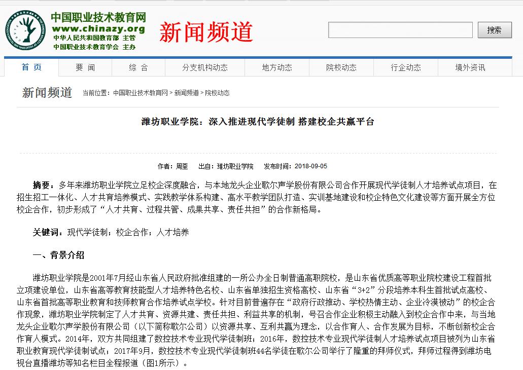以山东省职业教育现代学徒制试点为契机,由我院与歌尔股份有限公司合作组建的数控技术专业现代学徒制试点班自2017年成立以来,在校企双方的共同努力下平稳有序推进,得到社会各界的广泛关注。