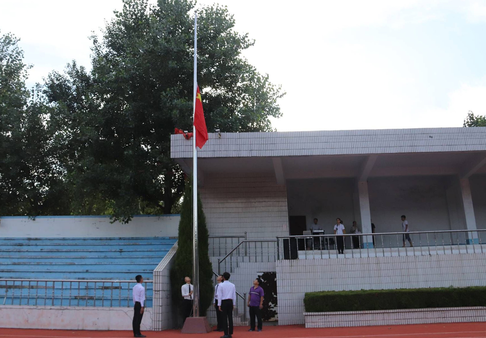 上午7点整,升旗仪式正式开始。beplay(中国)国旗护卫队成员迈着铿锵的步伐来到了国旗台下。在激昂的国歌声中,鲜艳的五星红旗徐徐升起。全体唱国歌、行注目礼,庄严肃穆。