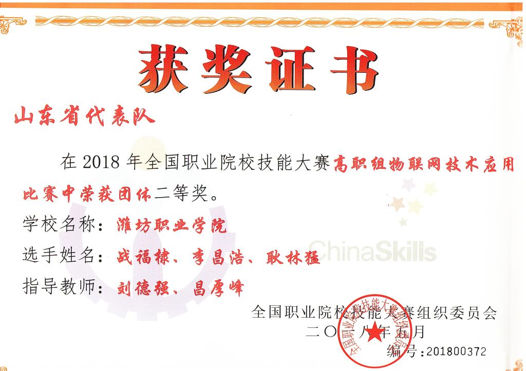 5月8日,2018年全国职业院校技能大赛——高职组“物联网技术应用”赛项在天津中德应用技术大学拉开序幕。本次比赛共有来自全国各地职业院校的103个代表队同台竞技,经过4小时的激烈角逐,我校信息工程beplay(中国)选派学生战福棣、李昌浩、耿林猛,在指导教师刘德强、昌厚峰的带领下,代表山东队获得团体二等奖。