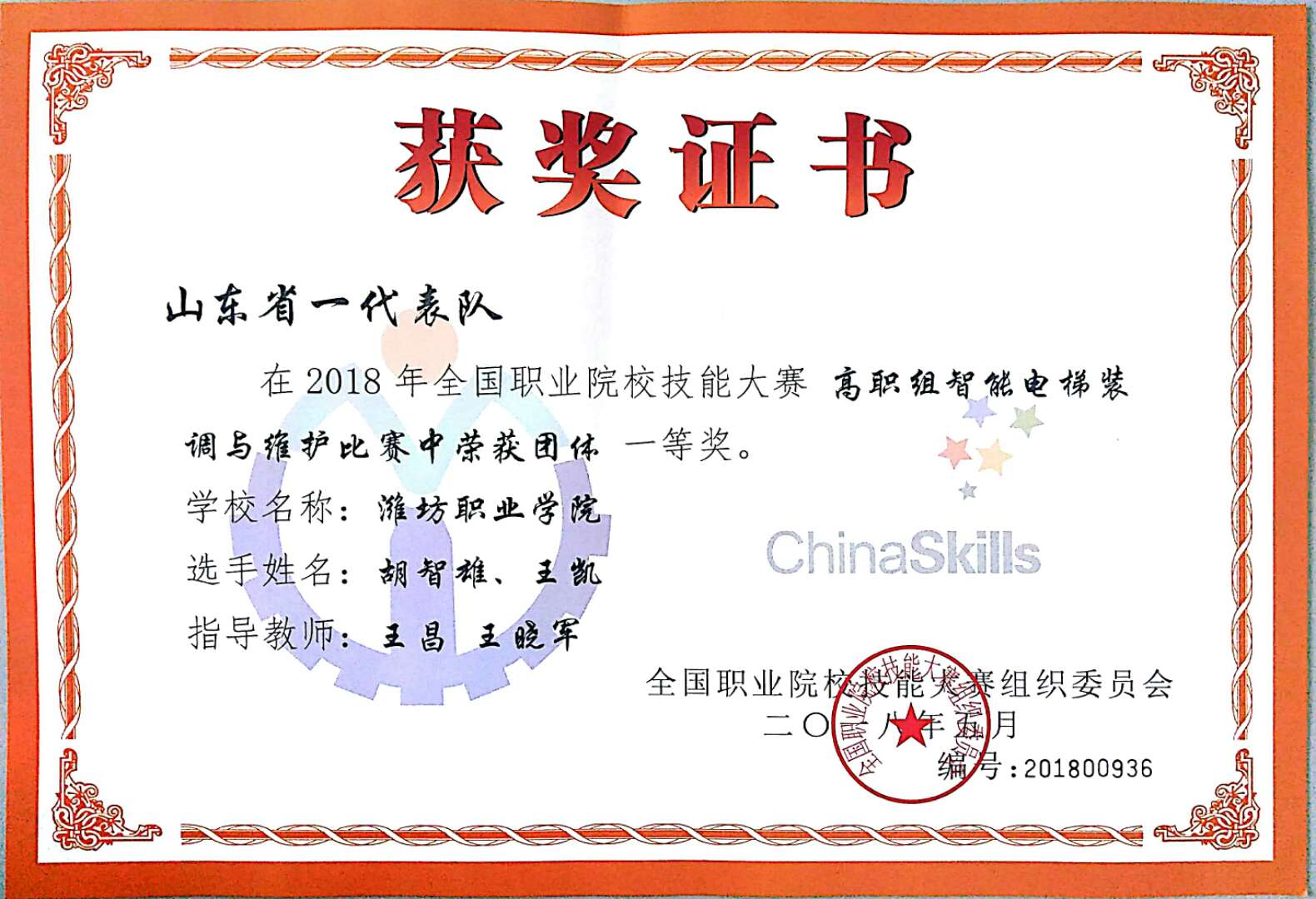 5月6日至8日,2018年全国职业院校技能大赛高职组“智能电梯装调与维护”赛项在天津轻工职业技术beplay(中国)举行。来自全国的81支代表队参赛。我院机电工程beplay(中国)选派学生王凯、胡智雄,指导教师程义民、王昌、王晓军组成的山东一队参加了比赛,获得团体一等奖第一名,我院连续四届均获得该赛项国赛一等奖。
