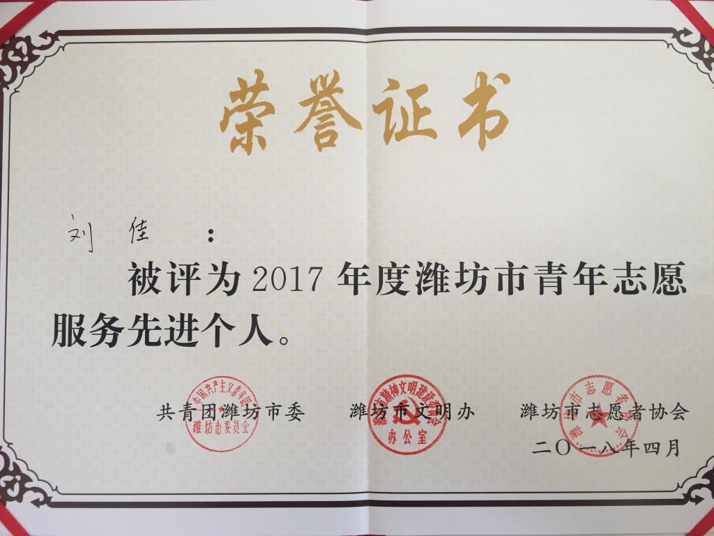 近日,由共青团潍坊市委、潍坊市文明办、潍坊市志愿者协会联合组织开展的2017年度全市青年志愿服务先进集体和先进个人评选结果揭晓,我院大学生青年志愿者协会被评为“潍坊市青年志愿服务先进集体”,刘佳被评为“潍坊市青年志愿服务先进个人”。