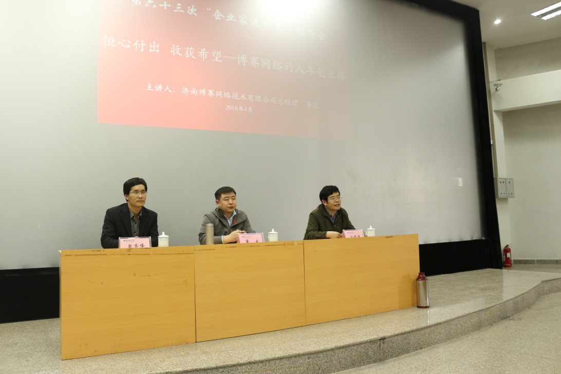 董良先生的报告结合自身的求学、求职以及创业的经历,启发同学们珍惜在校学习机会。董先生从自己上大学早期的迷茫讲起,到后来确定学习网络技术作为自己的努力方向,通过自己的坚持和努力,自学考取了含金量较高的网络技术认证证书,为自己毕业后的求职奠定了基础。董先生在工作几年、有了一定的积累以后,开启了创业之路。2010年4月创立济南博赛网络技术有限公司,公司最初从事网络技术培训,从最初只有一名员工、一间办公室,到现在拥有100余名员工、三大业务体系、6家子公司、6个城市开展业务,并有多项拥有自主知识产权的产品。公司自2013年以来,一直处于华为技术培训全国前三名。