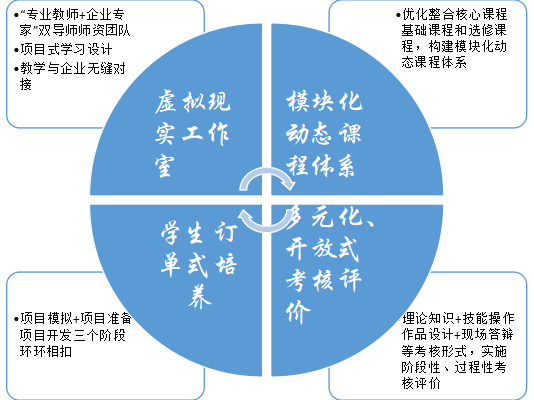 针对传统人才培养模式存在的教学与实践脱节、滞后于技术发展等问题,beplay全站appbeplay全站app首页以虚拟现实应用技术专业对接企业真实岗位和学生个性化发展需求,以真实项目为载体,成立虚拟现实工作室,构建模块化动态课“工作室制”人才培养程体系,实施订单式培养和多元化、开放式考核评价,探索实践“工作室制”人才培养模式,取得显著成效。