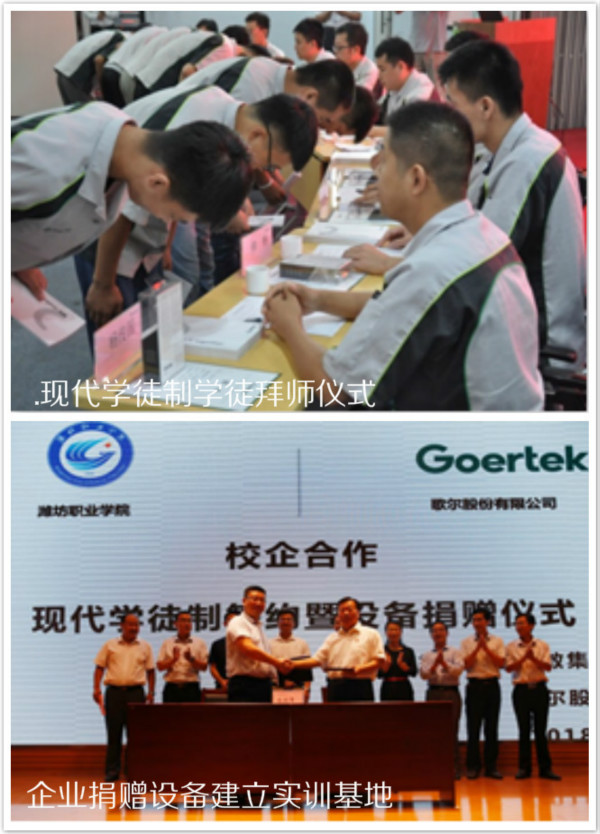 针对这些问题,2012年beplay(中国)与歌尔探索德国双元学徒制人才培养,2014年与歌尔组建了数控技术专业现代学徒制班,探索现代学徒制高技能人才培养规律。与歌尔的人才培养,以准职业人的培养理念,创新实施招生即招工、入校即入厂、毕业即就业的“产教结合,学岗融通”现代学徒制人才培养模式,将生产劳动和社会实践融入到人才培养的各个环节。融通教学内容与职业岗位需求,构建职业素质教育体系和实践教学体系。培养过程分为基本素质培养、核心技能训练、企业实践历练三个阶段,将职业素养、专业理论学习、综合能力培养有机结合,按照企业对员工的标准培养学生,使其具备“准职业人”的基本素质,为即将进入企业成为员工零距离对接,实现校企双主体育人。