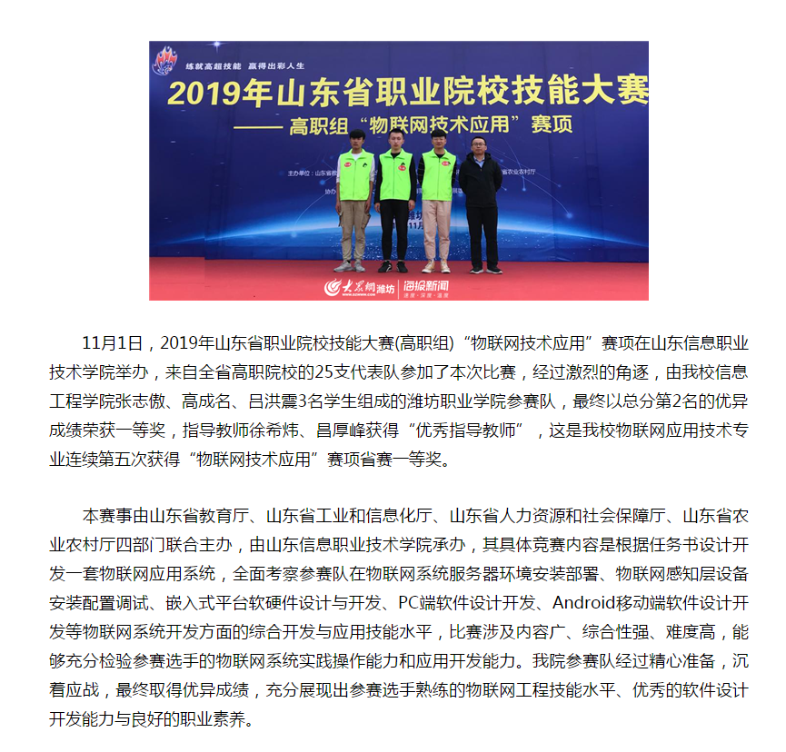 [大众网]beplay全站appbeplay全站app首页获2019年山东省职业院校技能大赛“物联网技术应用”赛项一等奖