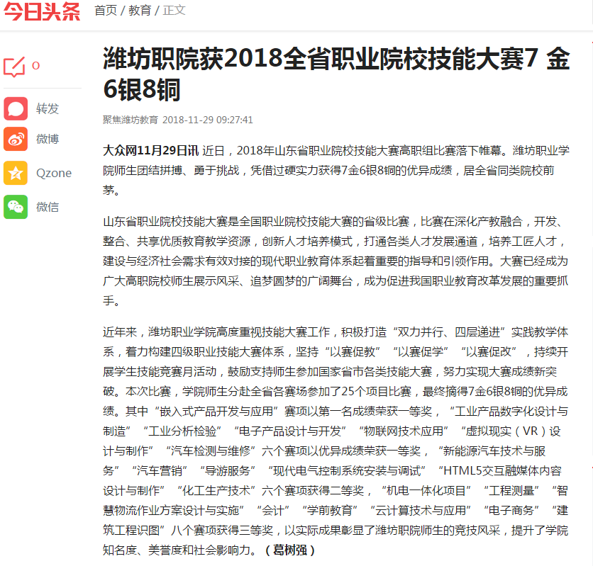 [今日头条]潍坊职院获2018全省职业院校技能大赛7金6银8铜