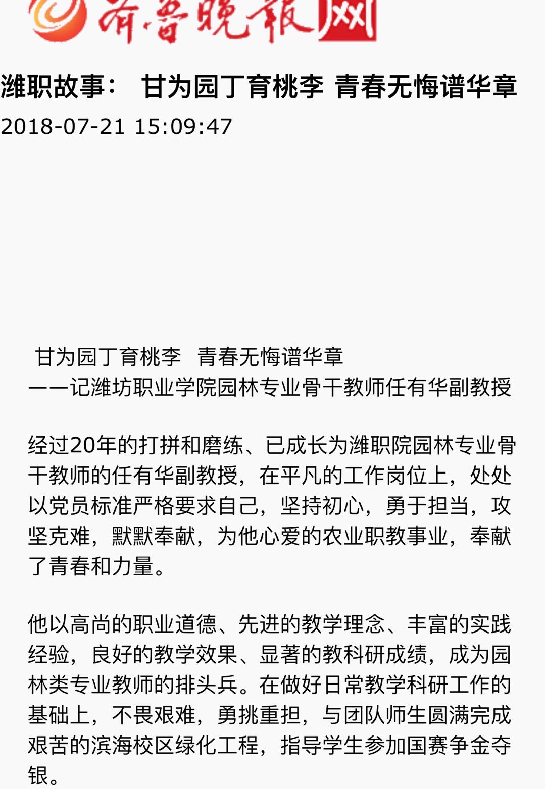 [齐鲁晚报]潍职故事:甘为园丁育桃李 青春无悔谱华章——记beplay全站appbeplay全站app首页园林专业骨干教师任有华副教授