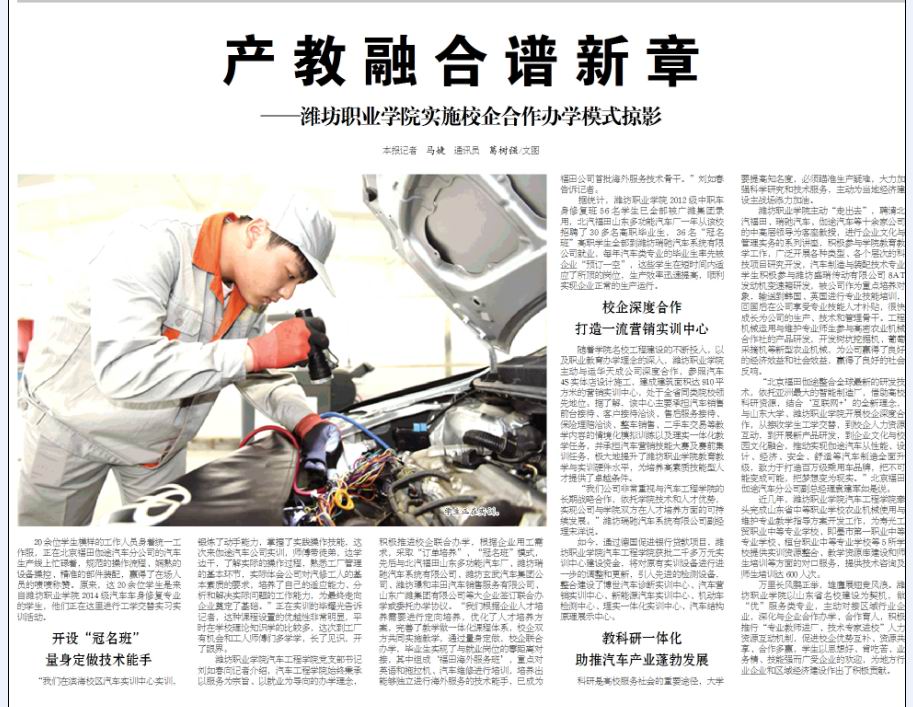 “汽车工程beplay(中国)始终秉承以服务为宗旨、以就业为导向的办学理念,积极推进校企联合办学,根据企业用工需求,采取‘订单培养’、‘冠名班’模式,先后与北汽福田山东多功能汽车厂、潍坊瑞驰汽车系统有限公司、潍坊玄武汽车集团公司、潍坊璟和丰田汽车销售服务有限公司、山东广潍集团有限公司等大企业签订联合办学或委托办学协议。我们根据企业人才培养需要进行定向培养,优化了人才培养方案,完善了教学做一体化课程体系,校企双方共同实施教学,通过量身定做,校企联合办学,毕业生实现了与就业岗位的零距离对接,其中组成‘福田海外服务班’,重点对英语和拖拉机、汽车维修进行培训,培养出能够独立进行海外服务的技术能手,已成为福田公司首批海外服务技术骨干。”汽车工程beplay(中国)党支部书记刘如春介绍说。